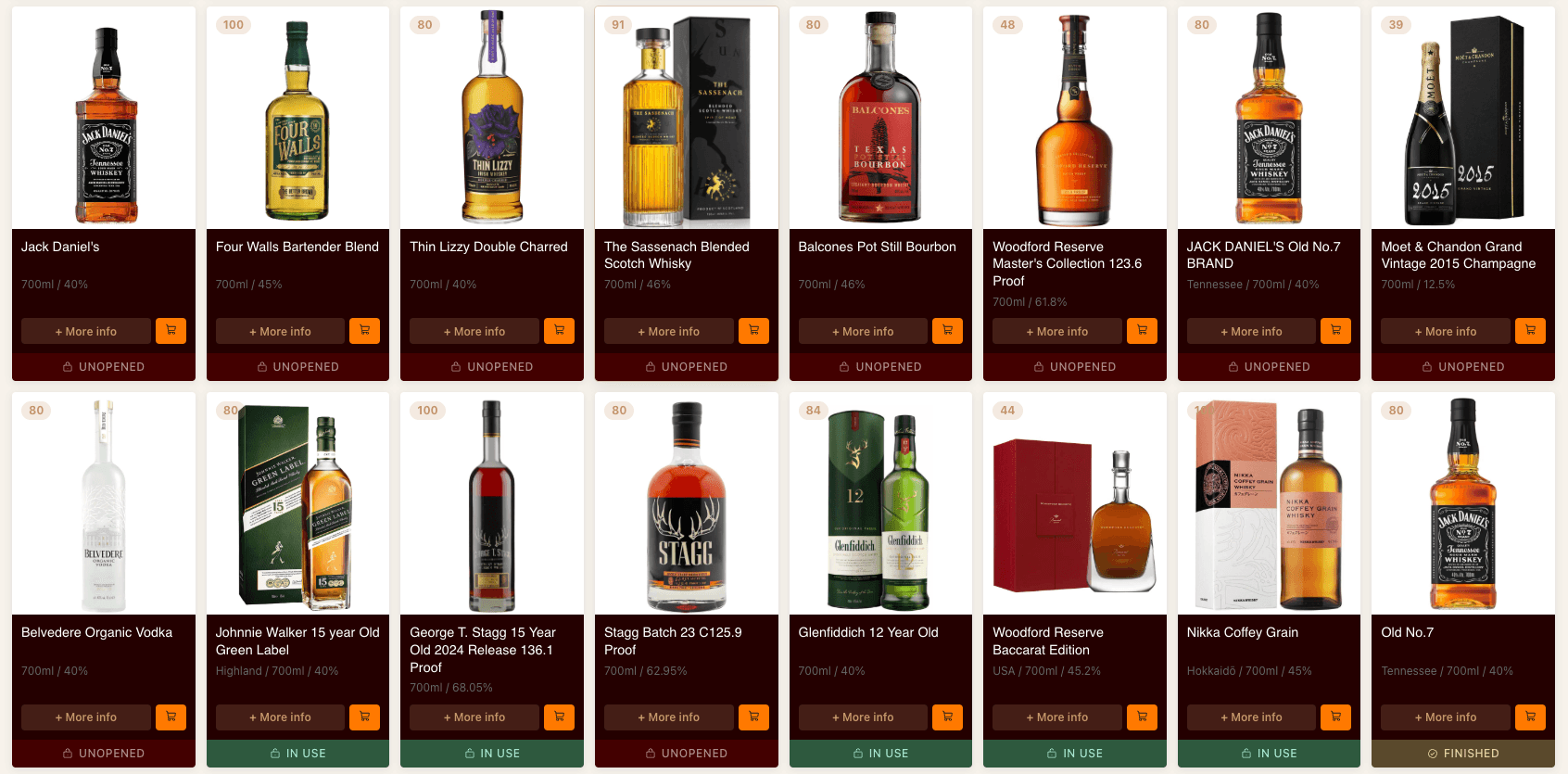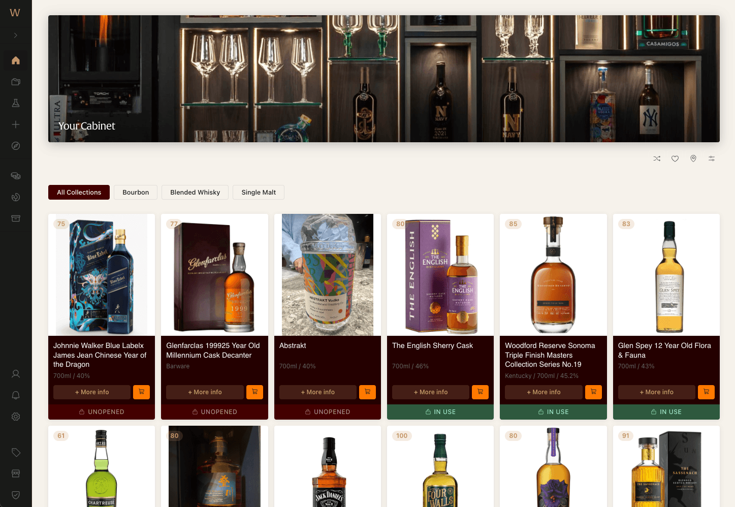 Every bottle tracked with the detail it deserves. Barcode scanning, bottle levels, stats dashboard, and full data export.
