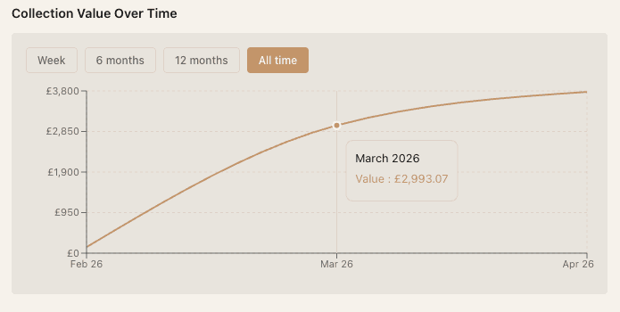 Track what your shelf is worth. Purchase prices, value over time, and insurance-ready PDF export.