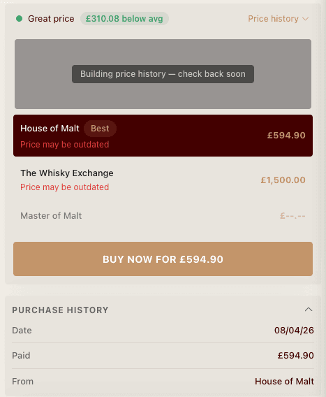 We check prices across specialist UK whisky retailers. Master of Malt, The Whisky Exchange, The Whisky Shop, and more. Then we show you the cheapest. Even when it's not a retailer we earn from.